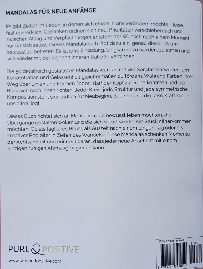 Es gibt Zeiten im Leben, in denen sich etwas in uns verändern möchte — leise, fast unmerklich. Gedanken ordnen sich neu, Prioritäten verschieben sich und zwischen Alltag und Verpflichtungen entsteht der Wunsch nach einem Moment nur für sich selbst. Dieses Mandalabuch lädt dazu ein, genau diesen Raum bewusst zu betreten. Es ist eine Einladung, langsamer zu werden, zu atmen und sich wieder mit der eigenen inneren Ruhe zu verbinden. Die 50 detailreich gestalteten Mandalas wurden mit viel Sorgfalt entworfen, um Konzentration und Gelassenheit gleichermaßen zu fördern. Während Farben ihren Weg über Linien und Formen finden, darf der Kopf zur Ruhe kommen und der Blick sich nach innen richten. Jeder Kreis, jede Struktur und jede symmetrische Komposition steht sinnbildlich für Neubeginn, Balance und die leise Kraft, die in uns allen liegt.